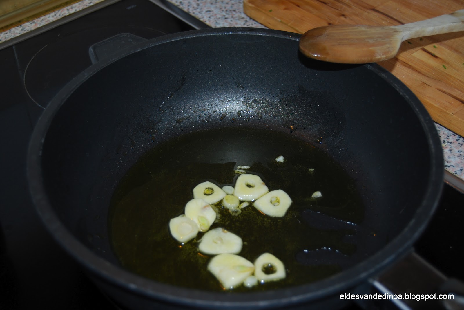 Mientras tanto en una sartén profunda pondremos cuatro cucharadas de aceite y sofreiremos a fuego bajo un diente de ajo partido en láminas, hasta que esté un poquito blando y empiece a coger algo de color.